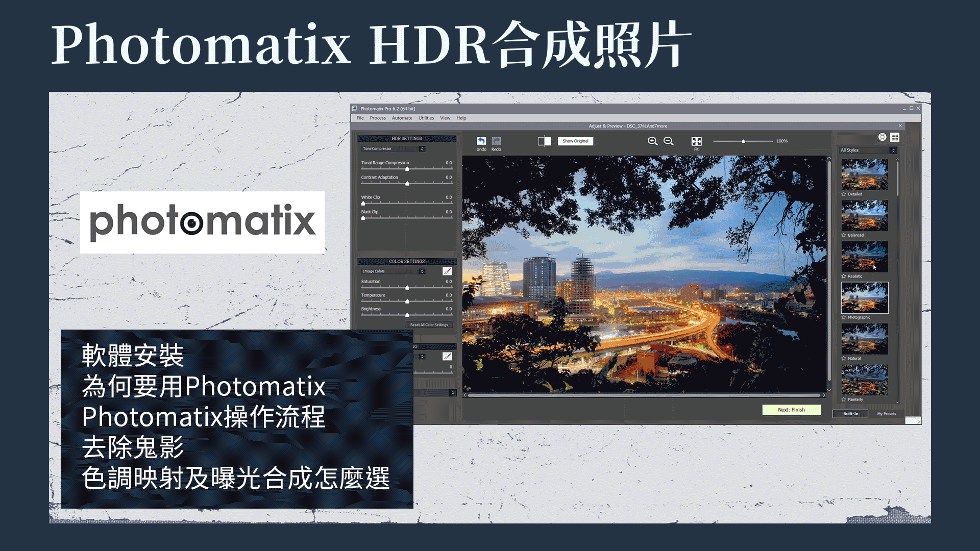 PHOTOMATIX台灣較少人使用,但國外的攝影師很多都用這一套軟體,這是個專門處理HDR照片的軟體,因為有眾多的預設選項、兩種演算方法,除了不同場景能找到最合適的預設之外,透過內建調整能讓鬼影消除,也可以自己手動處理,隨著版本的更新,處理的細節也更自然豐富,很推薦大家拍HDR用這套軟體處理。