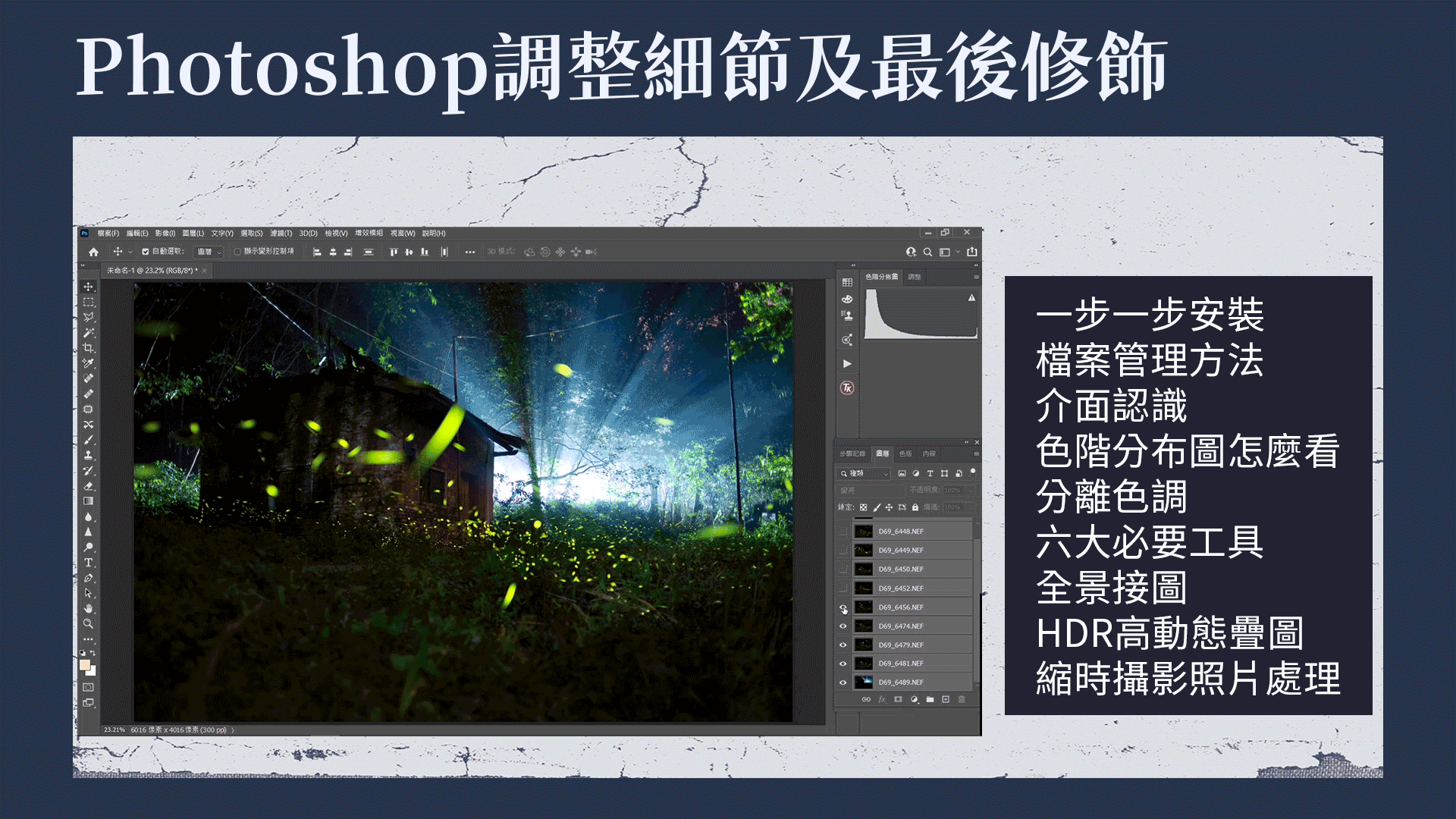 所以這邊主要會教大家疊圖,學會了疊圖後,面對較為困難的題材就更得心應手,像一般常見的車軌等也是會用到Photoshop喔,所以必學!